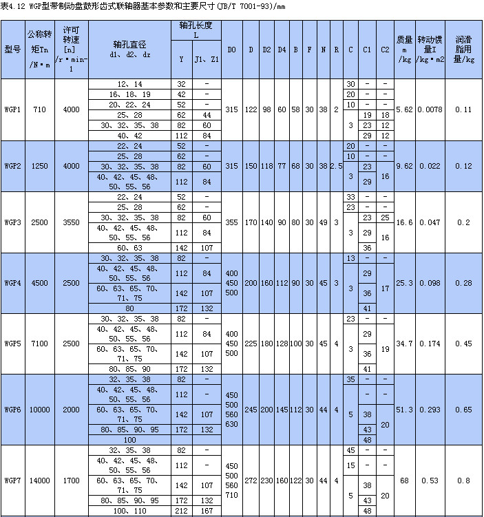 WGP帶制動盤鼓形齒式聯軸器在工作時,兩軸產生相對角位移,內外齒的齒面周期性作軸向相對滑動,必然形成齒面磨損和功率消耗,因此,齒式聯軸器需在有良好和密封的狀態下工作。齒式聯軸器徑向尺寸小,承載能力大,常用于低速重載工況條件的軸系傳動,高精度并經動平衡的齒式聯軸器可用于高速傳動。