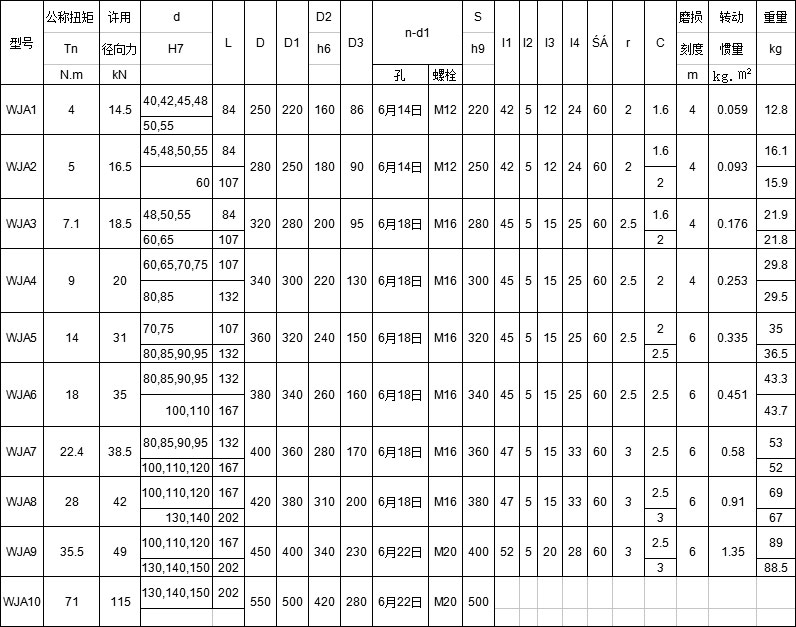 WJA型球面滾子聯(lián)軸器基本參數(shù)和主要尺寸:(JB/T 7009-93) mm