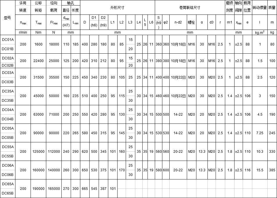 DC系列卷筒用鼓形齒式聯軸器主要參數及尺寸: mm