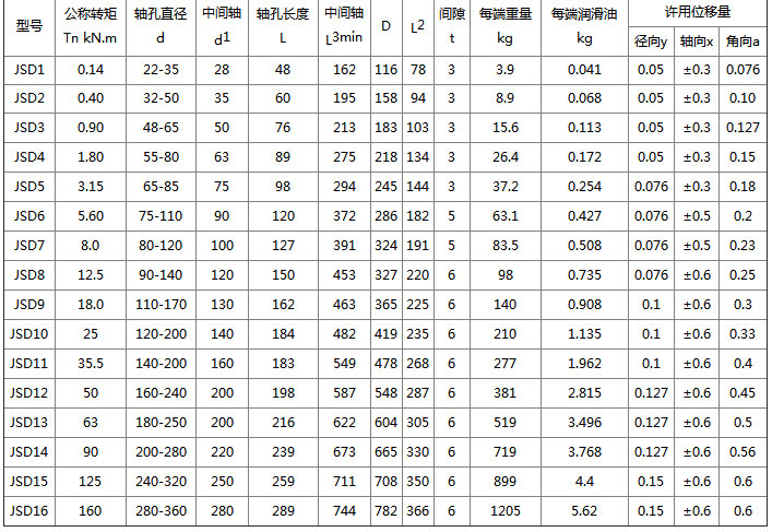 JSD型蛇型彈簧聯軸器 特點及應用場合:與金屬彈性元件撓性聯軸器相比,具有機械強度高,承載能力大、質量輕結構尺寸小、傳動效率和傳動精度高,可靠性好、裝拆方便等特點。適用于中、高速、大轉矩軸系傳動。與鼓形齒式聯軸器相比,具有無相對滑動,不需潤滑,使用壽命長、無噪聲、結構簡單等特點.可部分代替鼓形齒式聯輔器。不受溫度和油污影響。具有耐酸、堿,防腐蝕的特點。可用于高溫、低溫和有油、有水和腐蝕介質的工況環境.適用于各種機械裝置載荷變化不大的軸系傳動,通用性極強,工業發達國家已普遍采用,是我國重點推廣應用的高性能撓性聯軸囂,高精度膜片聯軸器可用于高速工況。膜片聯軸器與齒式聯軸器相比,沒有相對滑動,不需要潤滑、密封,無噪聲,基本不用維修,制造較方便,可部分代替齒式聯軸器。膜片聯軸器在國際上工業發達國家應用已很普遍,在實際應用中一般采用接中間軸型,以提高兩軸線偏移補償性能。