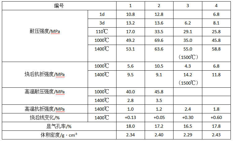 從表1-2看出,編號1和編號2的1d強度較高,可滿足吊運的需要。1000~1400℃的強度比表6-5中的普通黏土耐火澆注料的高得多,但高溫抗折強度基本相似;編號3和編號4的常溫強度和燒后強度比編號1和編號2低些,比普通黏土耐火澆注料略高些,其特別是高溫抗折強度較高,約提高1倍。另外,高強度黏土耐火澆注料的燒后線變化,一般呈膨脹狀態,有利于使用。同時,顯氣孔率較低,說明其組織結構較致密,有利于提高性能。