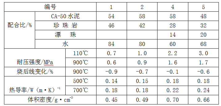 從表1-1中還可以看出,適量增加粉煤灰漂珠,能提高耐火澆注料的強度,但體積密度有所增大,熱導率略有提高。因此,應根據窯爐的使用條件,合理選擇膨脹珍珠巖耐火澆注料的品種。例如,在軋鋼或鍛鋼加熱爐爐頂上,采用黏土或低水泥耐火澆注料澆灌后,再用表內編號1或編號2珍珠巖耐火澆注料作隔熱層,取得了良好的的節能效果。