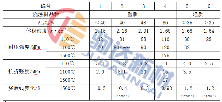 表1-1 高鋁質(zhì)和輕骨料耐堿澆注料的性能