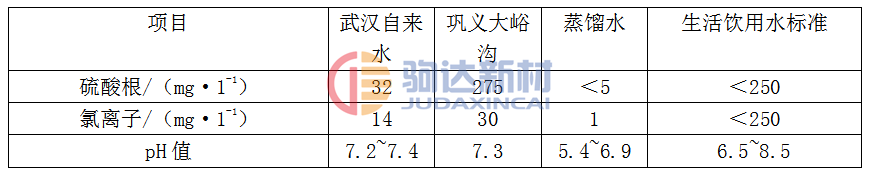 空氣中的酸性氣體CO2、CO2、H2S是高鋁澆注料發(fā)生碳酸化和硫酸化現(xiàn)象的原因之一,而現(xiàn)場澆注料用水質(zhì)量也不容忽視,尤其是水中的SO42-和H+,對高鋁水泥水化物也起一定的侵蝕作用。表2為幾種水源質(zhì)量對比。與武漢地區(qū)水源相比,鞏義大峪溝生產(chǎn)現(xiàn)場所用的水,其[SO42-]和[Cl-]指標高,其中[SO42-]超出了國家底面生活飲用水標準,而蒸餾水中[SO42-]超出了國家地面生活飲用水標準,而蒸餾水中[SO42-]和[Cl-]最低。這與生產(chǎn)現(xiàn)場附近有一個硫酸廠不無關(guān)系。