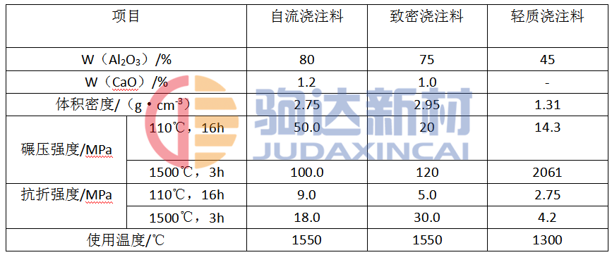 從實際現(xiàn)場高鋁澆注料粉化現(xiàn)象看,高鋁澆注料暴露在空氣中損壞與其硫酸化、碳酸化過程以及水源質(zhì)量有關(guān)。在實驗室選擇了一種輕質(zhì)澆注料,引入高鋁水泥作為結(jié)合劑,用磷酸鹽為分散劑,其性能指標見表1。考慮水源質(zhì)量、養(yǎng)護條件以及在澆注料中添加外加劑(Na2SO4和Na2CO3),驗證上述因素的影響。