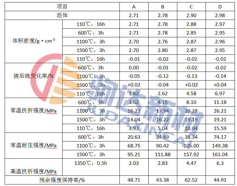 四種不同配比的澆注料物理性能列于表3。