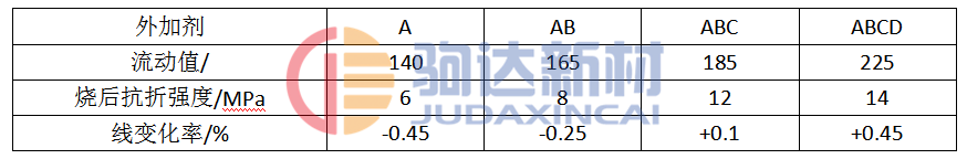 在自流澆注料中,外加劑的應用十分重要。本次研究選用多種外加劑進行了試驗,結果見表4。由表4可知,采用單一外加劑時,澆注料流動值較小,無法滿足施工要求。選用兩種以上外加劑復合使用,流動值增大,強度增高,線變化率較小,材料性能得到較大改善。這主要是復合外加劑具有解膠、分散、潤濕、排氣等功能,可顯著地改變物料表面性能,達到減水增強之效果。