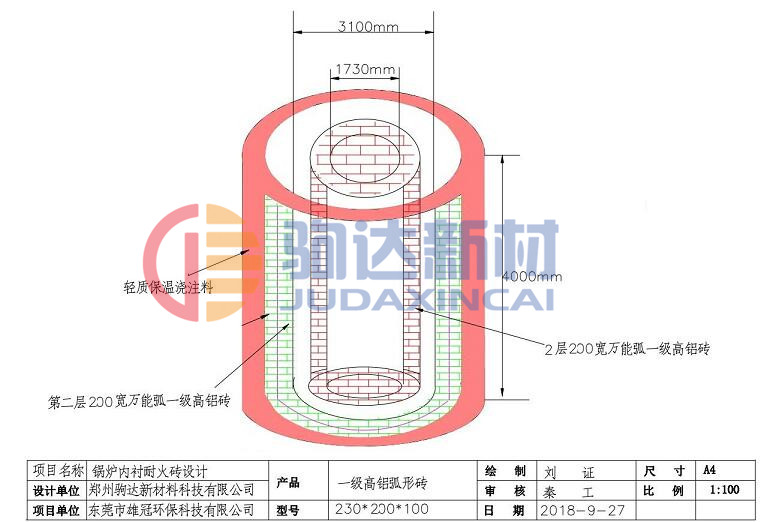 我公司是專業從事耐火材料的生產制造與窯爐的設計安裝工作,主要生產耐火磚有高鋁材質、粘土材質、剛玉材質、碳化硅材質和輕質隔熱耐火磚等耐火材料,近期我公司收到東莞雄冠環?萍加邢薰,發來的30t熱解爐使用耐火材料的分布圖并希望能夠得到我公司在材料與設計安裝上的支持,收到相關資料后我公司設計安裝部門進行了核對,并繪制相關使用的萬能弧耐火磚的設計砌筑方法。雄冠環保提供的熱解爐相關資料。