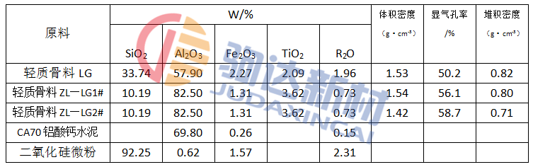 試驗所用原料主要有普通輕質高鋁骨料、輕質高強微孔礬土骨料、漂珠、藍晶石和二氧化硅微粉,以CA70鋁酸水泥為結合劑,外加分散劑。部分原料的理化性能見表1。