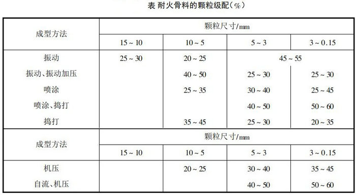 耐火骨料分為粗骨料和細(xì)骨料。一般顆粒尺寸大于5mm的稱(chēng)為粗骨料;5mm及5m以下至 0.09mm的稱(chēng)為細(xì)骨料。骨料臨界粒徑根據(jù)村體厚度而定,一般為10mm或15mm,大型構(gòu)筑物如高爐基墩和鋼包澆注料等,可采用20mm或25mm的顆粒。另外,施工制作方法不同,耐火骨料的臨界粒徑也不同,詳見(jiàn)下表。目前,耐火骨料臨界粒徑有增大的傾向,應(yīng)當(dāng)指出,在配制不定形耐火材料時(shí),其耐火骨料顆粒級(jí)配應(yīng)符合表中的技術(shù)要求,即使用統(tǒng)料,也應(yīng)篩分檢驗(yàn)達(dá)到其要求,方可使用。