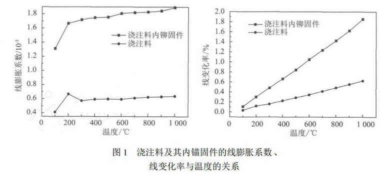 所以必須綜合考慮錨固件表面膨脹縫的處理,如果縫隙留的過大,錨固件與澆注料分離,容易氧化斷裂,起不到錨固效果。如果留的小,容易引起澆注料的膨脹開裂。圖1分別是澆注料及其內錨固件的線膨脹系數、線變化率與溫度的關系圖,從圖上可以看出;隨著溫度增加,澆注料與其內錨固件的線膨脹系數、線變化率差異增大,錨固件的線膨脹系數是澆注的3 倍 ,因此在爐窯加熱的過程中,必須考慮錨固件的加熱膨脹量的問題。