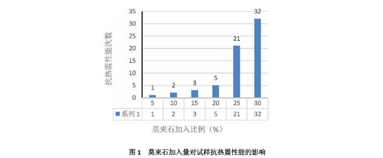 以白剛玉、燒結莫來石為主要原料,以AL2O3微粉、Cr2O3微粉、少量添加劑為基質,以進口木質素溶液為結合劑,莫來石加入量(質量分數分別為0、5%、10%、15%、20%、25%、30%)對鉻剛玉磚抗熱震性能和其他物理性能的影響。結果表明:1600℃燒后試樣,隨著莫來石加入量的增加,體積密度和耐壓強度均會呈下降趨勢,抗熱震性能則呈逐漸增加趨勢,但增加的量并不明顯,只有加入量在25%以上時抗熱震性能則會降低。綜合對比,莫來石加入量在25%~30%著個區間比較合適,既能滿足熱震需求,又能保證其他物理指標處于均衡狀態。不同莫來石加入量對試樣抗熱震性能的影響如圖1所示
