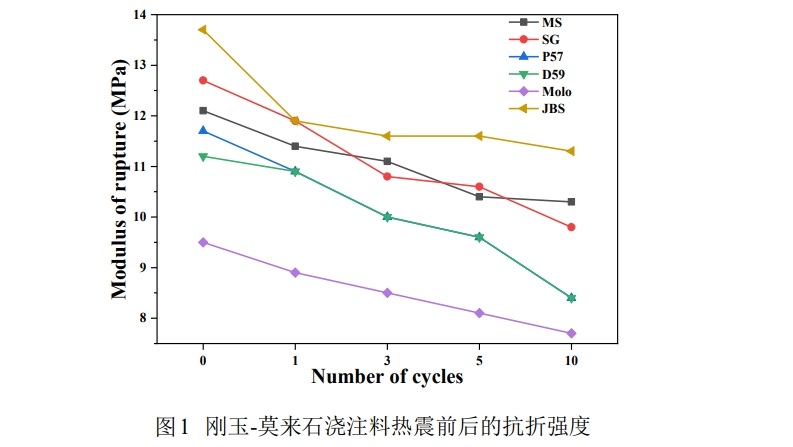 各種澆注料在不同熱震次數后的抗折強度如圖1 所示。由圖1可以看出,隨著熱震次數的增加,各澆注料的強度均逐漸降低,并且經過1次循環后澆注料的抗折強度下降最為劇烈。這是因為在首次熱震過程中所產生的熱應力較高,導致澆注料裂紋的生成及快速擴展,使澆注料的抗折強度急劇下降。在第3次和5次循環后各澆注料的抗折強度的減小均逐漸趨于平緩。此時,澆注料中的裂紋呈準靜態擴展狀態,裂紋的擴展速率較慢,使熱震后的澆注料抗折強度下降較為平緩。在第10次循環后各試樣的抗折強度再次下降較為劇烈。此時,由于熱震次數累積,導致澆注料中的裂紋擴展尺寸較大,使得澆注料的抗折強度再次出現驟降現象。