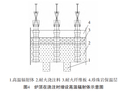 為增強爐頂輻射換熱及減少爐頂散熱損失,在 澆筑爐頂時,采用異形模板的方式進行整體澆筑,在 澆筑爐頂部位直接形成高溫輻射體[1],具體詳見圖4。 此方式解決了在已形成的澆筑爐頂上打孔懸掛高溫 輻射體脫落問題,同時將重質澆注料厚度由原來的 230 mm優化為200 mm,并增加其保溫層厚度,減少 爐頂散熱損失。