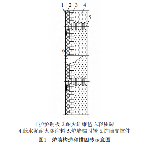 爐襯由耐火纖維氈、硅鈣板(或輕質保溫磚)及低水泥耐火澆注料組成。耐火纖維氈緊靠爐殼安放或放置在輕質磚與低水泥耐火澆注料襯之間。鋼筋拉桿用的固定件厚壁鋼管必須與爐殼鋼板焊接牢固。錨固磚長度應與爐墻總體厚度相配套,以滿足施工要求。錨固磚通過鋼筋拉桿與爐殼連接,且為活動式,錨固磚冷端面與爐殼間距應≥40 mm,這樣可隨著爐墻的漲落而上下移動,也能隨著爐墻的漲縮而 左右移動,保證了爐墻的穩定和使用壽命。