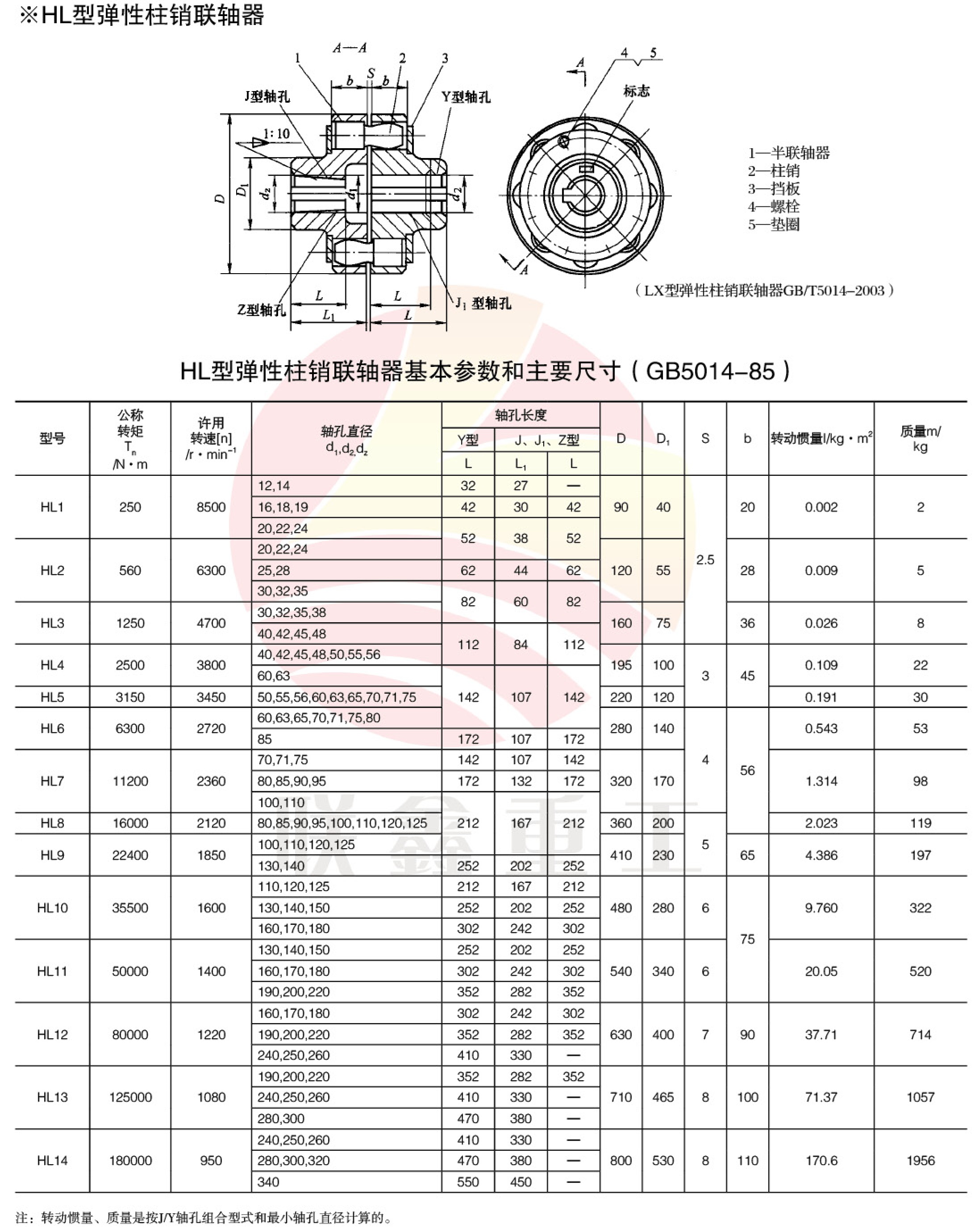 HL型彈性柱銷聯(lián)軸器簡稱“彈性柱銷聯(lián)軸器”屬于柱銷聯(lián)軸器的一種具有較大結(jié)構(gòu)簡單、合理,維修方便、兩面對稱可互換,壽命長,允許較大的軸向竄動,具有緩沖、減震等性能。HL型彈性柱銷聯(lián)軸器軸孔型式有:圓柱形(Y)、圓錐形(Z)和短圓柱形(J)。軸孔和鍵槽按國家標(biāo)準(zhǔn)GB3852-83《聯(lián)軸器軸柱和鍵槽形式及尺寸》的規(guī)定加工。