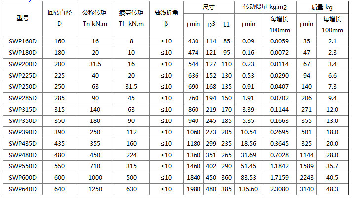 SWP-D型萬向聯軸器 特點及應用場合:軸承是易損件.為便于更換軸承,將軸承座壓蓋作成剖分式,螺栓聯接,可在β≤5°~10°工況下工作。適用于軋鋼機械、起重運輸機械、工程機械、礦山機械、石油機械及其他重型機械,聯接兩個不同軸線的軸系傳動,不能緩沖、減振。